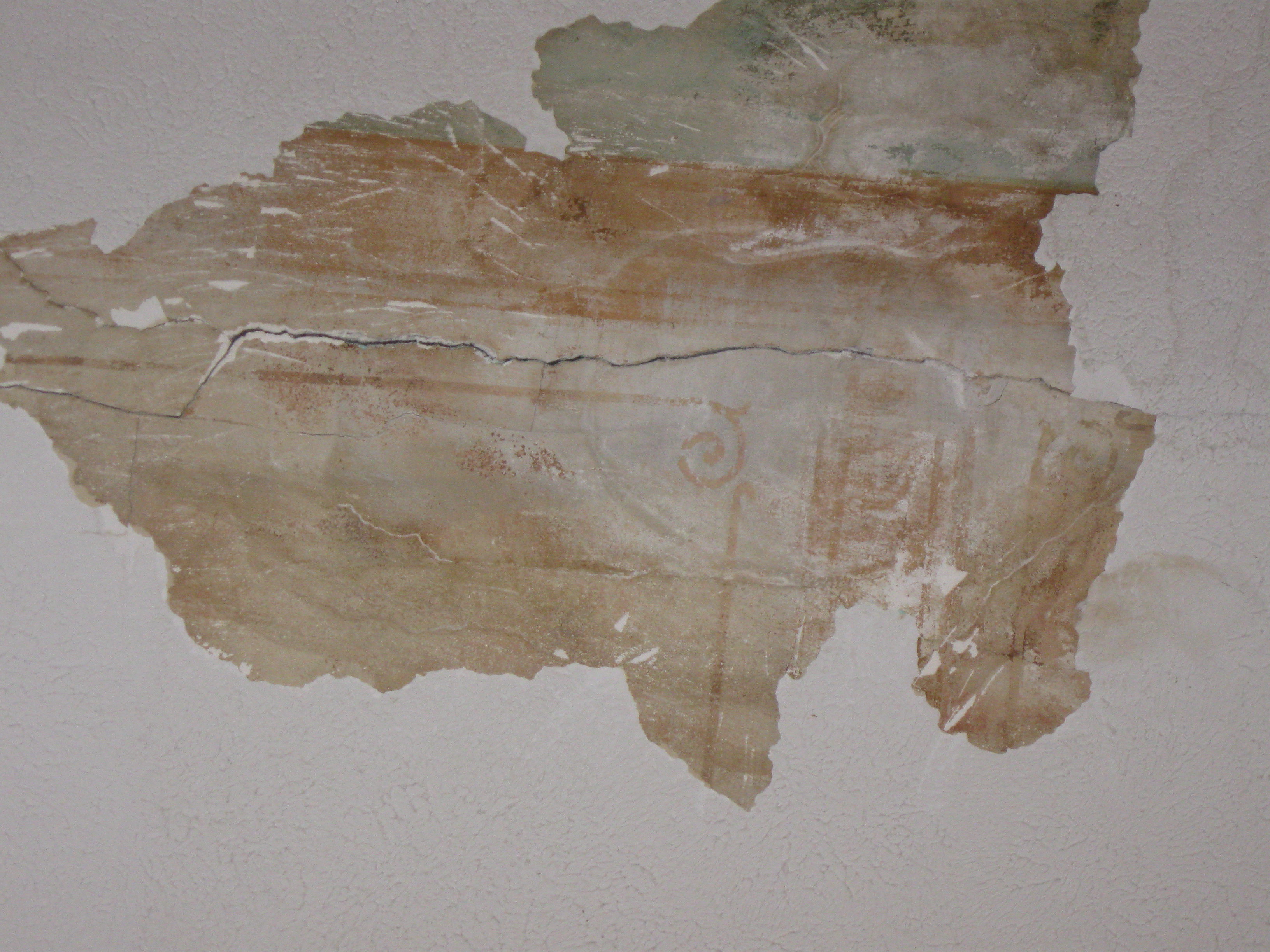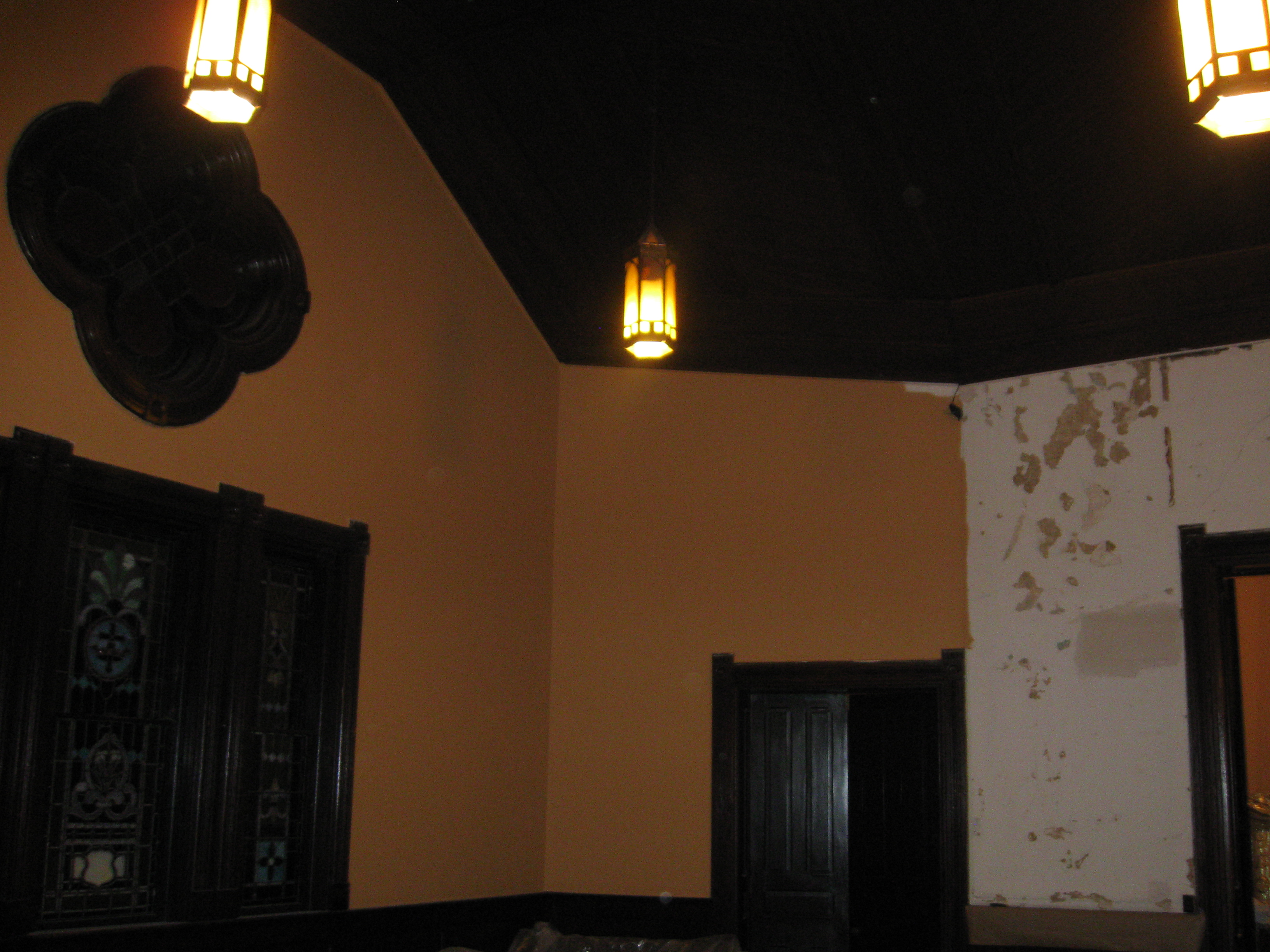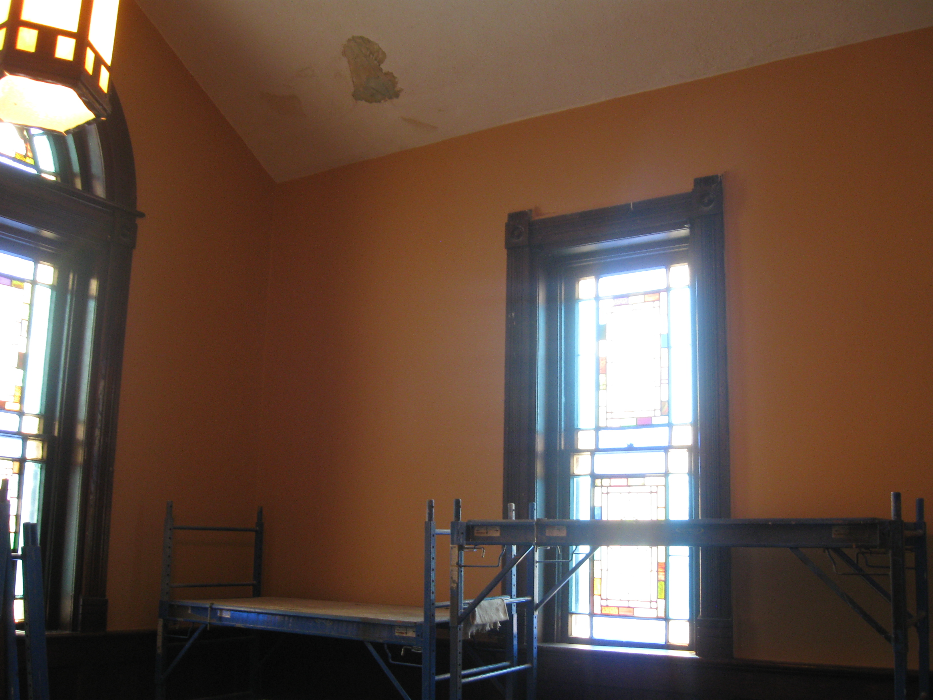 Interior plaster repair and paitning has begun. The wall color is an exact match of the original 1800's paint color. The original color was found when heating ducts were removed. Home Depot was able to accurately match the color form a plaster sample removed from the wall. The ceiling stencil is under a plaster over coat. We would like to remove the over coat and replicate the stencil on the ceiling when funding permits.